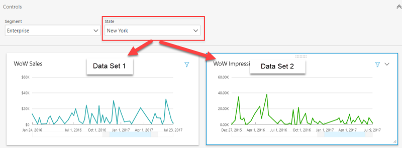 2 つのフィルターを作成したことにより、2 つの異なるデータセットを使っている場合でも、ひとつの State コントロール UI で両方のビジュアルを操作することができるようになりました。