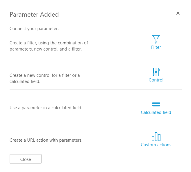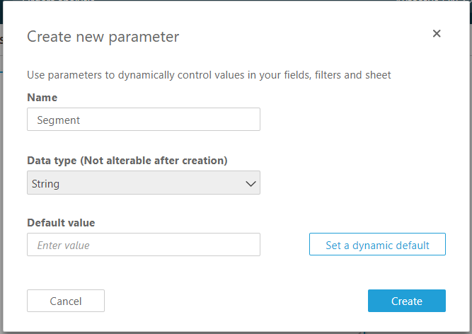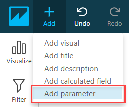 パラメーターを作成するには、分析画面で + Add ボタンをクリックして、Add parameter を選択します。続いてパラメーターに対して名前とデータ型を指定してください。テキストボックスやドロップダウンを使用したい場合には、String 型を指定しましょう。