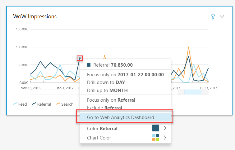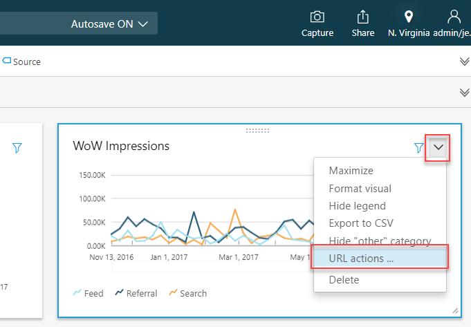 ダッシュボード 1 のもとになった分析画面を開いて、WoW Impressions ビジュアルの右上のメニューをクリックして、URL Actions を選択します。