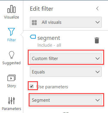 フィルターの設定画面で Custom Filter を選んで、Use parameters にチェックを入れます。そして先ほど作成したパラメーターを選択してください。