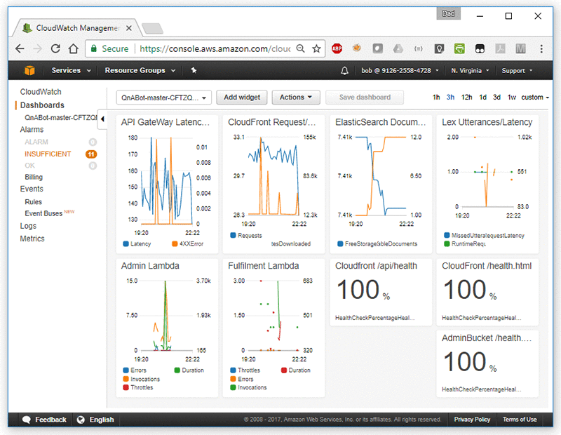 QnABot のメトリクスとログは、Amazon CloudWatch ダッシュボードを使用して参照できます。