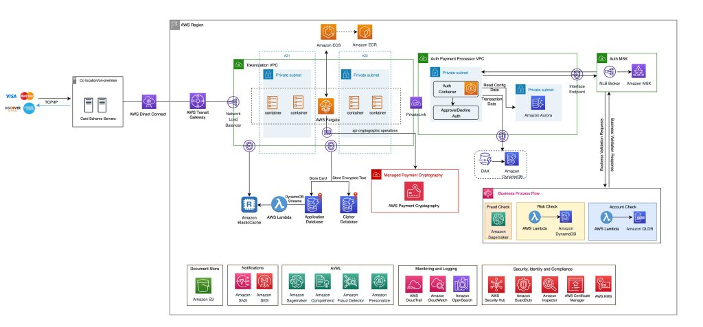 オーソリゼーションリクエストのトラフィックは、AWS Transit Gateway経由でNetwork Load Balancerを介してトークナイゼーションVPCにルーティングされます。Network Load Balancerは接続レベル(レイヤー4)で動作し、IPプロトコルデータに基づいて顧客VPC内のターゲットコンテナへ接続をルーティングします。トークナイゼーションVPCは機密カード情報をトークン化します。カードデータに対する検証や確認といった暗号処理は、AWS Payment Cryptographyのようなスケーラブルで耐障害性の高いサービス上で実行する必要があります。情報は暗号化されたデータベースに保存されますが、データベースに依存せずAmazon ElastiCacheから取得することができます。