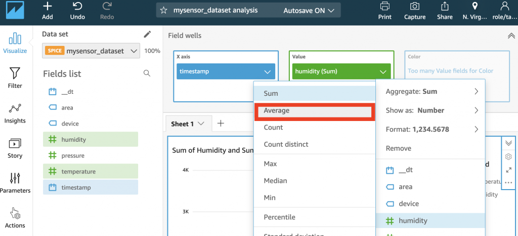 - Value のhumidity(Sum) > Aggregate: Sum > Averageをクリックします