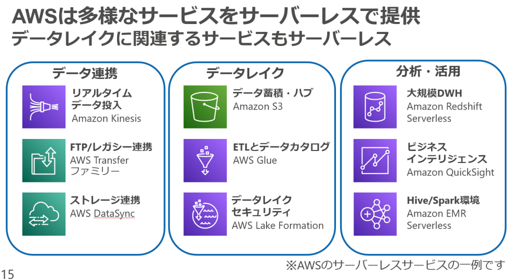 また、多くのデータ分析関連サービスがサーバーレスで提供されているため、導入の負担が少ないだけでなく、運用面での調整負担も少なくすることが可能です