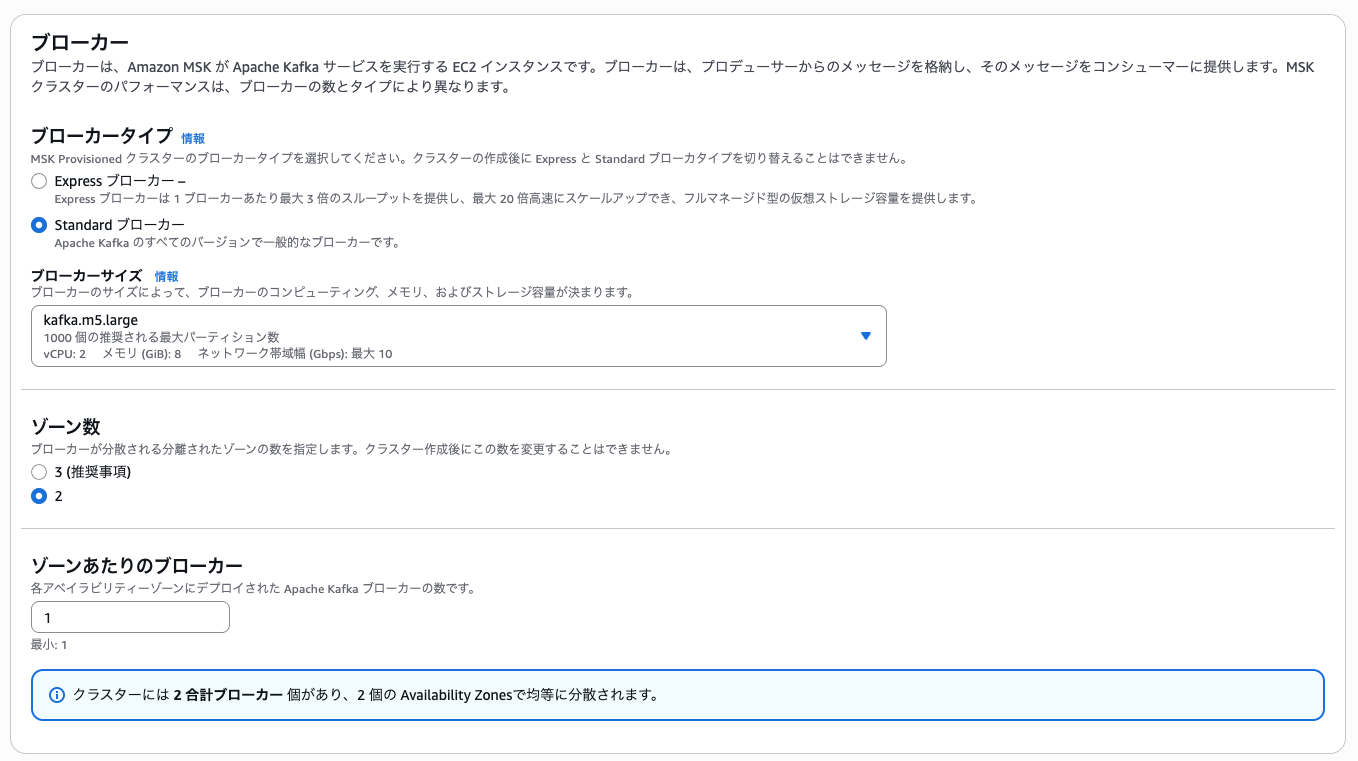 ブローカーは Standard を選択し、ブローカーサイズは、後続処理として VPC プライベート接続が必要な Amazon Data Firehose を利用するため、VPC プライベート接続が利用可能な m5.large インスタンスを利用します。ブローカーのゾーン数は配置先の VPC と合わせて数を選択します。今回は 2 を利用します。ゾーンあたりのブローカー数は、1つを選択します。要件に応じて一つのゾーン (AZ) に複数のブローカーを配置することも可能です。今回は、クラスターのストレージはデフォルト値を利用します。