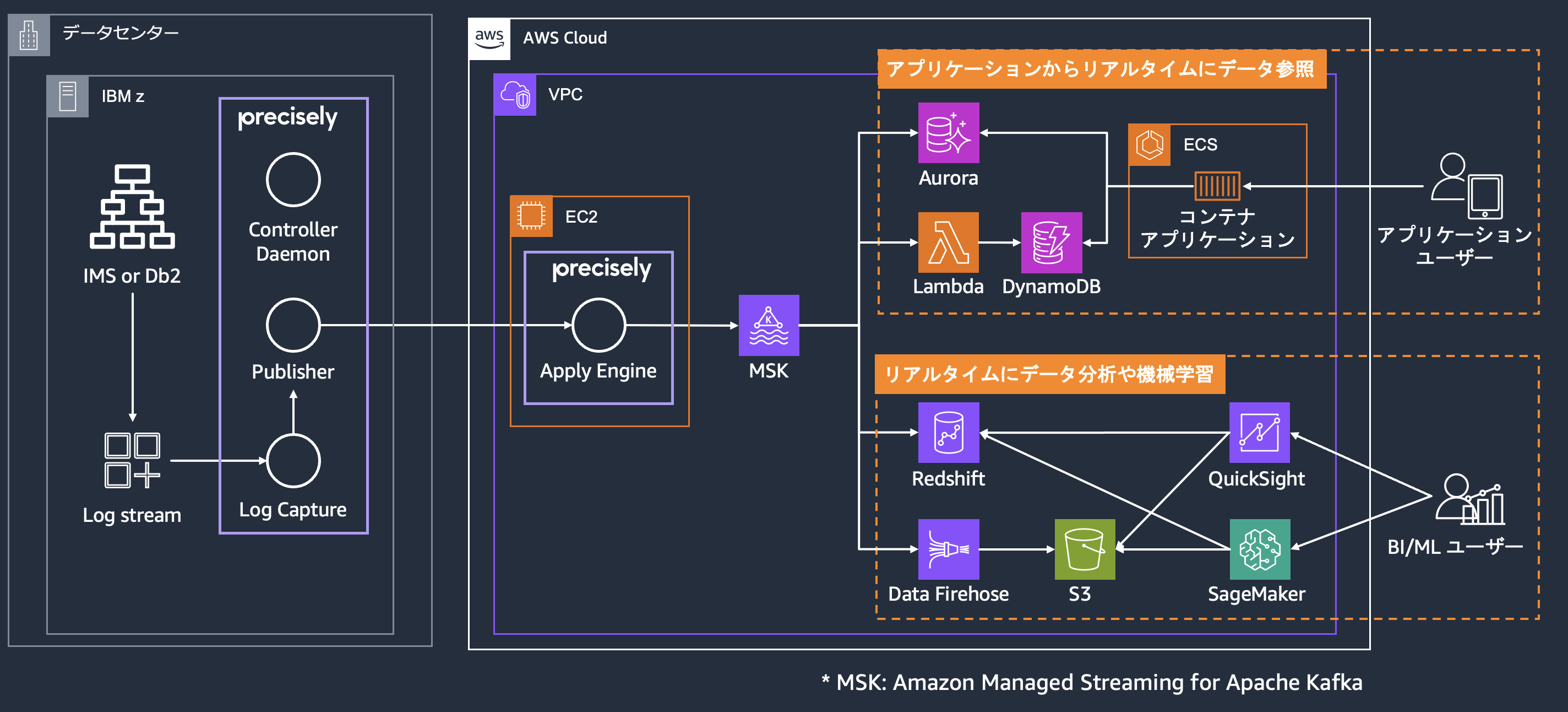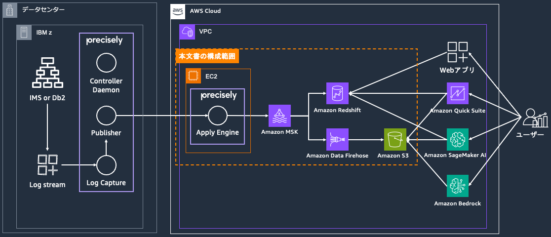 このアーキテクチャは、Amazon EC2 インスタンスでデプロイされた Precisely Apply Engine を境目として、メインフレーム側と AWS クラウド側に分けられます。メインフレーム側から送信されたデータは、Apply Engine で処理・変換され、後続の AWS サービスに送られます。メインフレーム側にはログ収集用のエージェントがインストールされており、データを一定量蓄積した上でのバッチ送信またはログストリームのニアリアルタイム送信が可能です。AWSクラウド側には Apply Engine を構成することで、ホストから送信されたデータを後続のサービスで利用しやすい形式に加工しながら連携することが可能です。MSK と組み合わせることで、Amazon Redshift、Amazon S3、Amazon RDS、Amazon Aurora、AWS Lambda など、様々なサービスに対してニアリアルタイムなデータ連携が可能です。本ブログ上では、S3 と Redshift に連携するための構成方法を扱います。