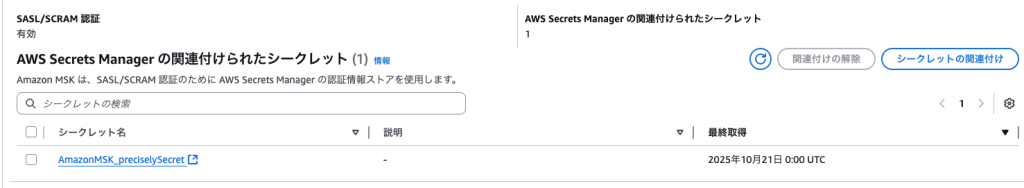 次に、MSK 側にて Apply Engine の認証設定を行います。Apply Engine が利用するユーザー名とパスワードを以下図のように Secrets Manager に保管します。暗号化にはカスタムキーによる暗号化を利用します。カスタムキーは AWS Key Management Service (KMS) を用いて作成できます。AWS マネージドキーを利用すると MSK では関連付けできませんのでご注意ください。具体的にはシークレットを作成してから、以下図のように、MSK クラスターのセキュリティ設定で関連付けを行います。なお、シークレットを作成するとき、命名ルールとして、AmazonMSK_のプレフィックスが必須です。