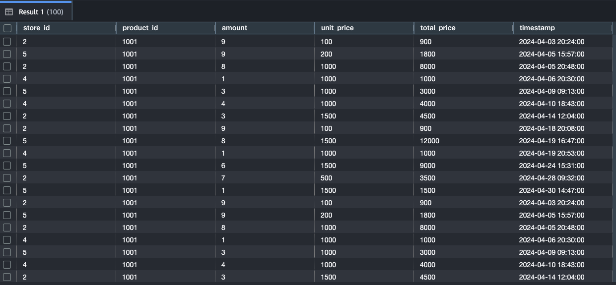 データソースとして使用した CSV の各列の意味はstore_id: 店舗ID, product_id: 商品ID, amount: 数量, unit_price: 単価, total_price: 合計金額, timestamp: 売上日時であり、実際のファイルは以下となります。