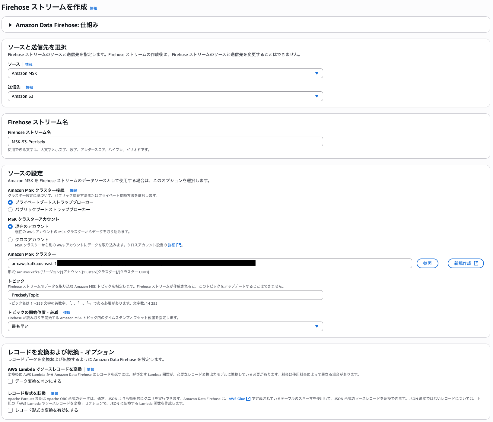 次に、データソースを MSK クラスター、送信先を S3 バケットとした Data Firehose の作成を行います。手順は以下の通りです。