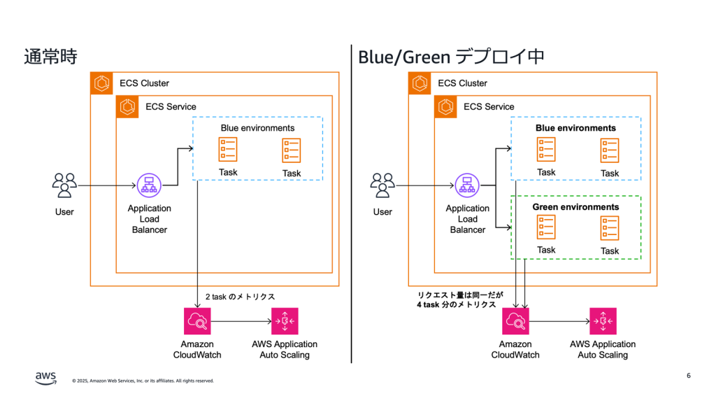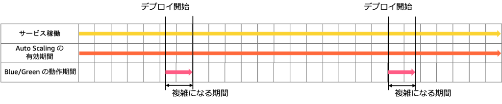 まず、複雑になるタイミングについて、Auto Scaling は常に対象のサービスのメトリクスを読み取りスケールを判断しています。一方、Blue/Green デプロイメントは、アプリケーションの更新時のデプロイ戦略の一つであるため、デプロイタイミングで一時的にデプロイ中という状態が発生します。