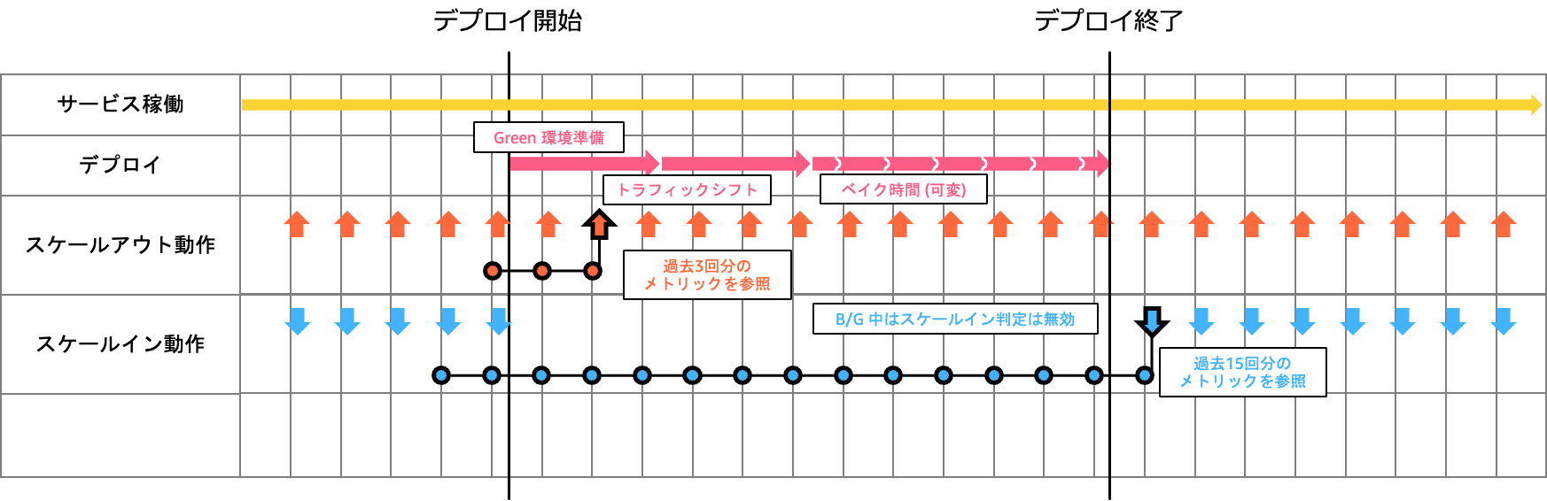注意点として、デプロイが終了した時点からスケールインのプロセスも有効になります。スケールイン実施判断に使用されるメトリクスは Blue/Green 中に出力されたメトリクスを含むため、厳密にはデプロイ完了直後において本来必要のないスケールインが発生するリスクが存在します。こちらは 4 で解説します。