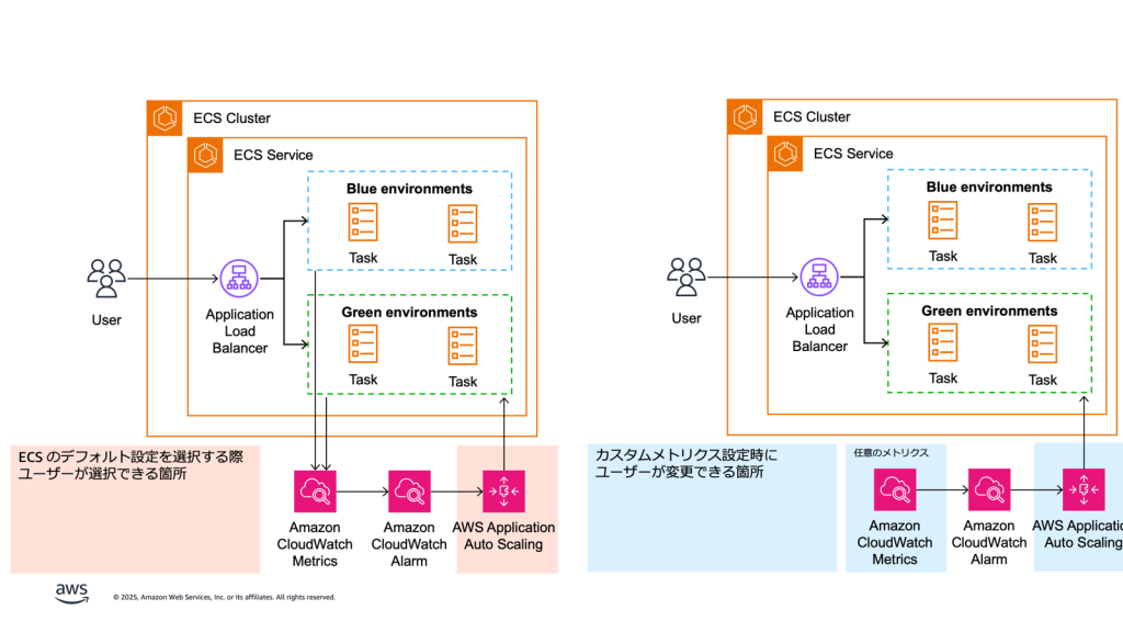 なお、以下説明で頻出する、ECS Service におけるカスタムのメトリクスやアラームを設定する具体的な方法については以下のブログを参考ください。