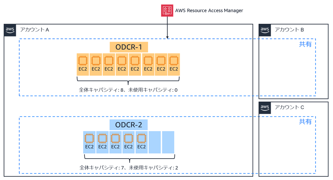 - ODCR-2: セキュリティパートナー(アカウント C)と共有される全体キャパシティ 5 個のインスタンス(すべて使用済み)