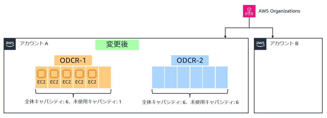 この機能は、既存のワークロードが中断されることなく継続的に実行されることを保証しながら、柔軟性を確保できるため、動的なワークロードにとって非常に貴重なツールとなります。ODCR-2 のキャパシティを 4 から 6 に変更する例については、次の図をご覧ください。