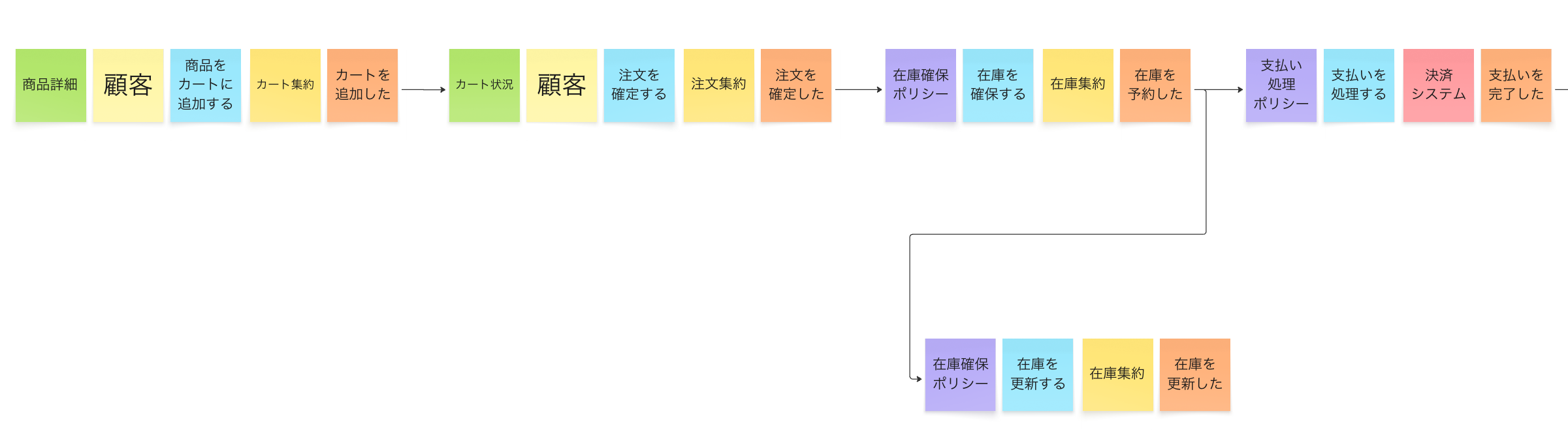 まず、イベントストーミングを実施し、注文プロセスのフローを可視化します。イベントストーミングでは、色分けされた付箋と付箋間の遷移のルールに従って、業務フローを可視化します。それぞれの付箋の意味と、今回の成果物の例を以下に記載します。
