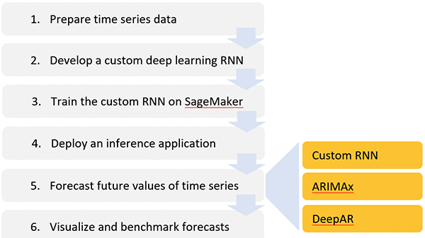 時系列予測モデルのパフォーマンスをきちんと評価するには、他の方法を適用し、異なる方法で得られた結果をお互いにベンチマークすることが最善です。ARIMAx と DeepAR を実装し、これらの 2 つの方法をカスタム RNN コンボと同じデータに適用するためのコードは、添付ファイルで提供されています。