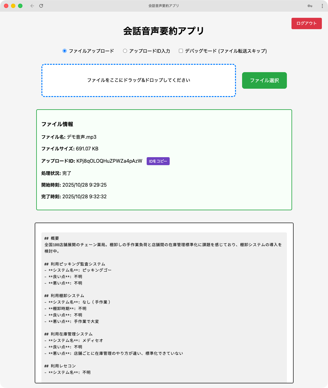このソリューションにより、音声ファイルをアップロードするだけで、営業活動の効率化と品質向上を同時に実現できる仕組みを構築しました。