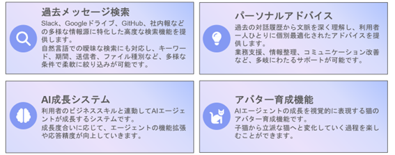 「パイオにゃん」は、Slack、Googleドライブ、GitHubといった社内の多様な情報源と連携し、過去のやり取りや文脈を深く理解することで、各個人に最適化されたアドバイスや情報を提供します。利用者のスキル向上と連動してAI自身もレベルアップし、アバターが視覚的に成長していく「AI成長システム」です。これにより、社員はゲーム感覚で自身の成長を実感でき、学習意欲の向上を促します。