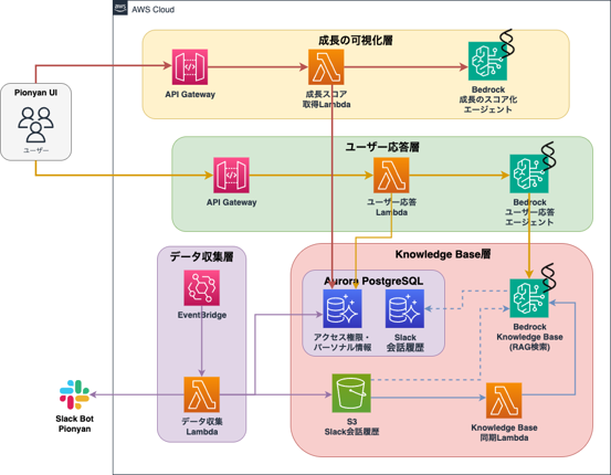 また、成長システムについては、Strands Agents SDK を利用して構築した AI エージェントが「組織独自のコンピテンシー定義」「ユーザーごとの会話履歴などの短期記憶、長期記憶」といったデータを元に、ユーザーの成長レーダーチャートを生成します。