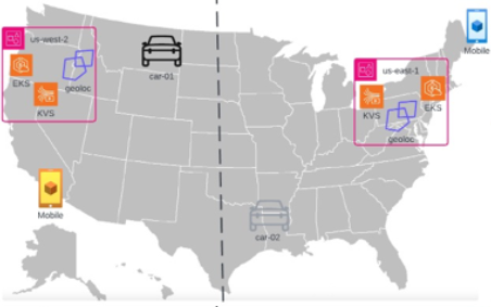 最適化された実装では、AWS Elastic Kubernetes Service (Amazon EKS) 上で us-east-1 および us-west-2 の両リージョンにデプロイされているクラウドサービスが、カスタムの地理位置情報サービスを使用して、車両がカンザス州レバノン (39°50′N 98°35′W) の東側か西側のどちらに位置するかを特定するのに役立ちます。AWS と Rivian は、この地点を米国の中心地と特定しています (図 4 の破線で示されています)。このサービスは、車両が存在するリージョンに共存するアプリケーションの Kinesis Video Streams シグナリングチャネルをプロビジョニングするのに役立ちます。上記の例 (図 4) では、モバイルデバイスが東海岸または西海岸のどちらにあるかに関係なく、car-01 は us-west-2 にシグナリングチャネルが設定されます。同様に、car-02 は us-east-1 リージョンに設定されます。