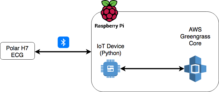 Raspberry Pi 3 は IoT デバイスと AWS Greengrass コア両方のホストです。IoT デバイスは、BLE 経由で心拍数モニターに接続し、心拍数データを収集する責任を担います。収集されたデータは、その後 AWS Greengrass コアにローカルに送信されます。データはここで処理され、セキュアな接続を通じてクラウドにルーティングされます。AWS Greengrass コアは、心拍数モニターの「エッジ」ゲートウェイとして機能します。