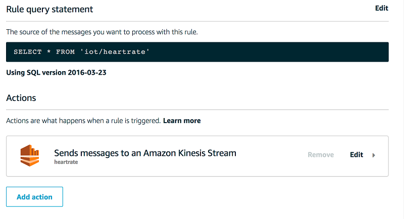 AWS Greengrass コアから AWS IoT Core に発行された心拍数データメッセージのさらなる処理とストレージを可能にするため、AWS IoT ルールを作成します。AWS IoT ルールは IoT/heartrate トピックに発行されたメッセージを取得し、それらを Kinesis アクション用の AWS IoT ルールアクションを通じて Kinesis データストリームに送信します。