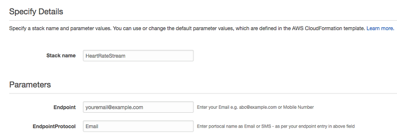 AWS CloudFormation テンプレートを起動するときは、パラメーターとして適切なエンドポイントプロトコル (「Email」または「SMS」) で E メールアドレスまたは携帯電話番号を入力するようにしてください。