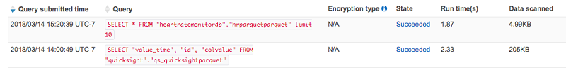 以下の画像にあるように、Parquet フォーマットテーブルから心拍データの最初の 10 行を取得しました。この Athena クエリは、row フォーマットでスキャンされた 205 KB のデータと比較して、4.99 KB のデータしかスキャンしていません。また、ランタイムに関しても、クエリパフォーマンスに大幅な向上が見られました。