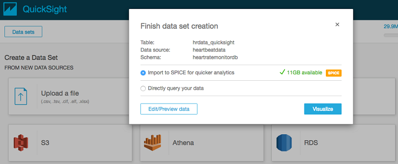 [Visualize] を選択して、SPICE がデータをキャッシュにインポートするのを待ちます。また、S3 バケットに対して新しいデータがパイプライン化されると、そのデータが SPICE にロードされるように定期的な更新をスケジュールすることもできます。