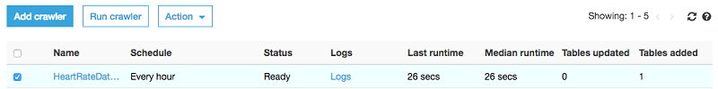 クローラのプロセスは、開始までに 20~60 秒かかる場合があります。これは Data Catalog に依存し、クローラ設定中に定義したとおり、データベース内にテーブルを作成します。