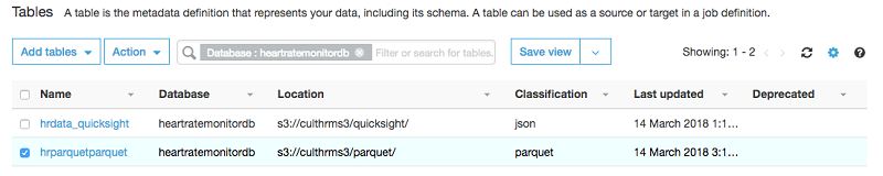 Amazon QuickSight での最初のステップは、新しい Amazon Athena データソースを作成することです。AWS Glue で作成された心拍数データベースを選択し、次に AWS Glue クローラによって作成されたテーブルを選択します。