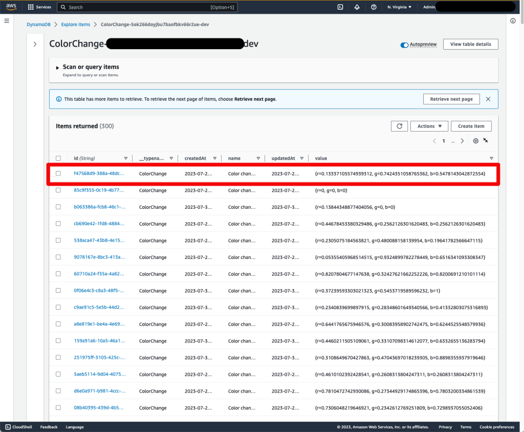 DynamoDB テーブルには、各イベントの色の値が記録されます。