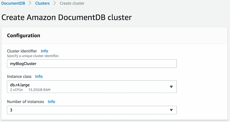 この記事では、以下のスクリーンショットにあるように、3 個の db.r4.large インスタンスで myBlogCluster という名前のクラスターをプロビジョニングするとしましょう。