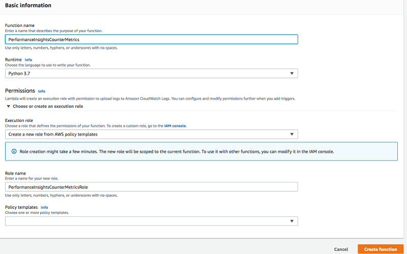このステップでは、Lambda 関数を修正して、複数のカウンターメトリクスと、Performance Insights が有効化された全 Amazon RDS インスタンスからのデータを送信するようにします。
