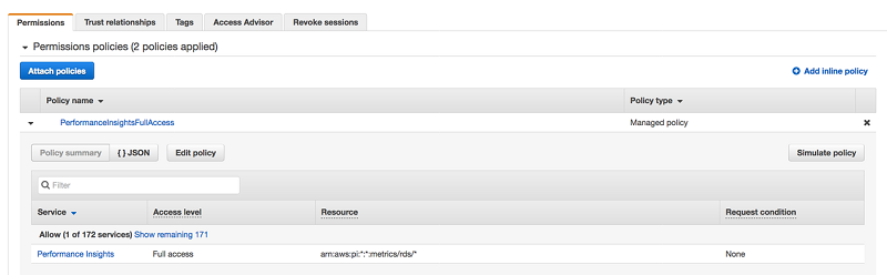 IAM で、先に作成しておいた PerformanceInsightsCounterMetricsRole を見つけます。次のアクセス権限ポリシーを含む PerformanceInsightsFullAccess ポリシーを作成および追加することで、Performance Insights API 呼び出しの権限を追加します。
