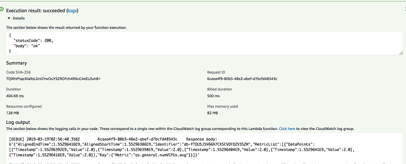Lambda 関数を再度実行すると成功のレスポンスが返され、表示されるログには、次のスクリーンショットにあるようなレスポンス内容が含まれているはずです。