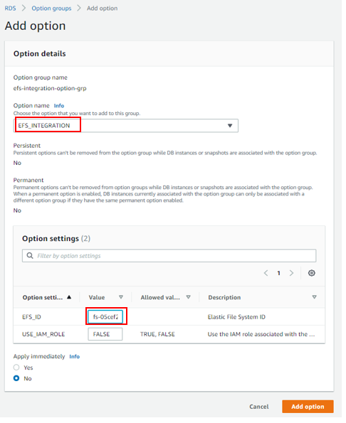 - オプション名には、「EFS_INTEGRATION」 を選択します。