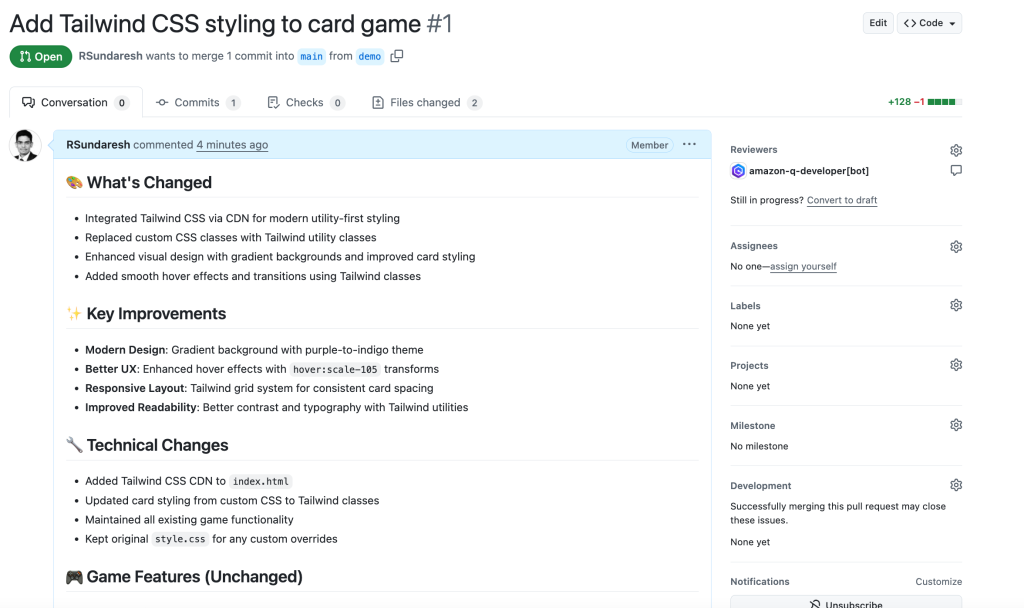 - Amazon Q Developerによるコードの自動レビュー : Amazon Q Developer がコードの品質、潜在的な問題、ベストプラクティスへの準拠状況を分析します。分析結果として簡潔な要約が最上部に表示され、変更の検知箇所が下部にスレッド形式で表示されました。これにより、全体像と詳細を 1 か所で把握できます。