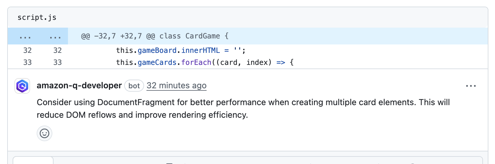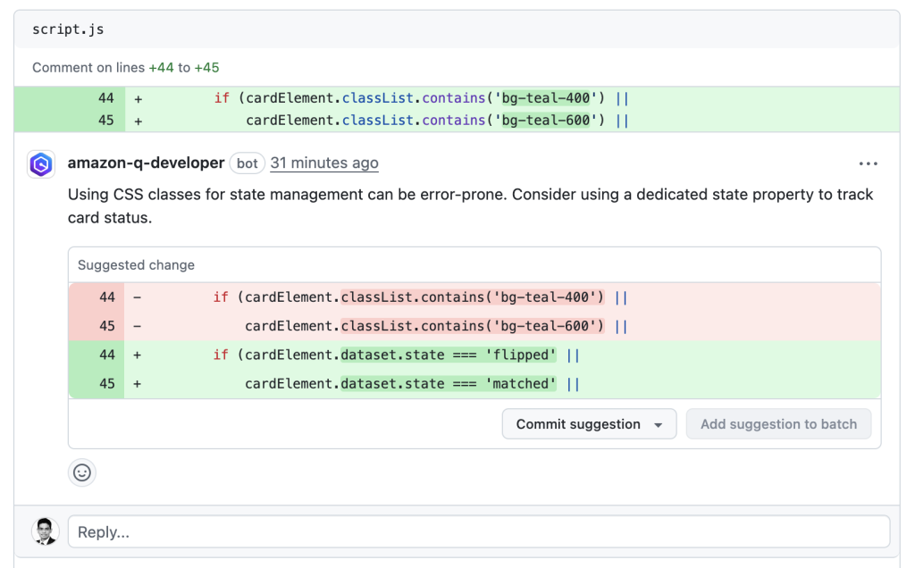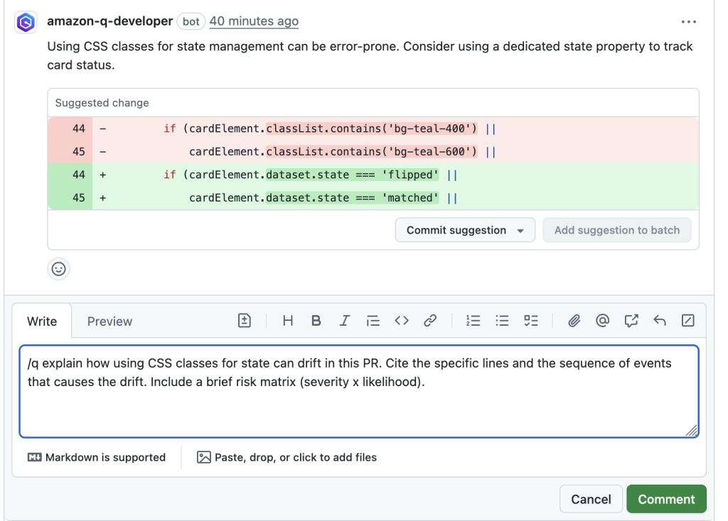 で説明を求める : 変更の検知箇所の一つについて、カードゲームにおけるカードの状態を保持するために、プロパティを使用することが提案されました。そこで Amazon Q Developer に詳細を確認しました。具体的な文脈と指針を迅速に提供してくれたため、やり取りが削減され、レビューの質が向上しました。
