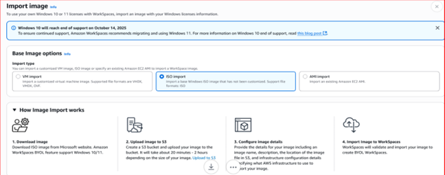 2.有効化後、Windows VM イメージを Amazon S3 にアップロードし、WorkSpaces コンソールからインポートする