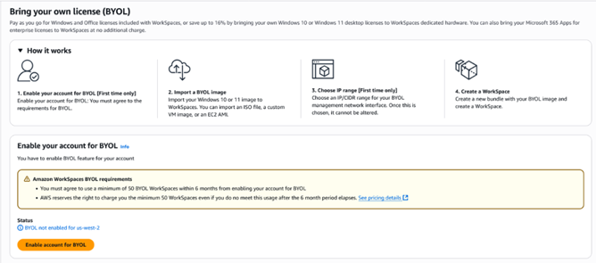 1.WorkSpaces コンソールで BYOL を有効化し、最小限の WorkSpaces 要件に同意する