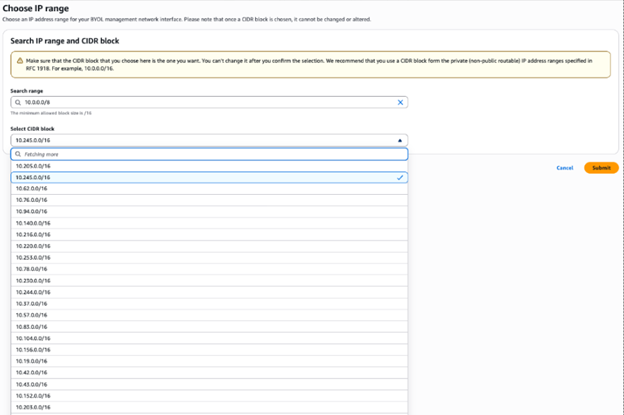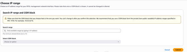 一度 IP アドレス範囲を指定すると、後から変更することはできません。内部ネットワークと衝突しないアドレス範囲を指定してください。IP アドレス範囲に関するガイダンスやご質問がある場合は、AWS サポートまたはアカウントチームにご相談ください。