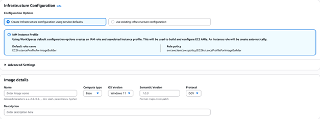 4.インフラストラクチャ設定では、EC2 Image Builder から既存のインフラ構成を選択するか、新しいものを作成します。これは、イメージを構築する際の設定をカスタマイズするために使用されます。詳細は AWS ドキュメントを参照してください