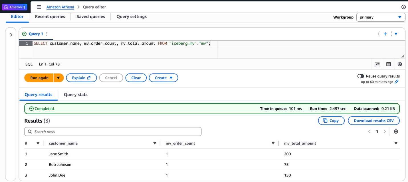 さらに、Athena SQL から同じマテリアライズドビューをクエリできます。以下のスクリーンショットは、Athena で実行された同じクエリと結果の出力を示しています。