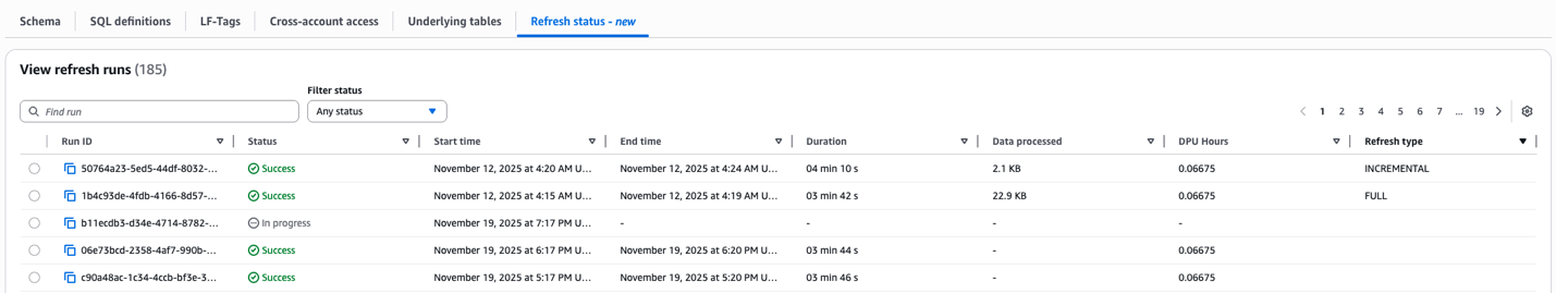 AWS Lake Formation コンソールには、API でトリガーされた更新の更新履歴が表示されます。マテリアライズドビューを開くと、更新タイプ (INCREMENTAL または FULL)、開始時刻と終了時刻、ステータスなどを確認できます。