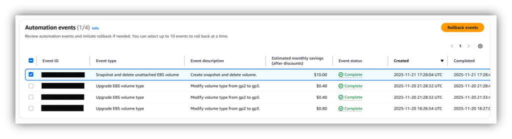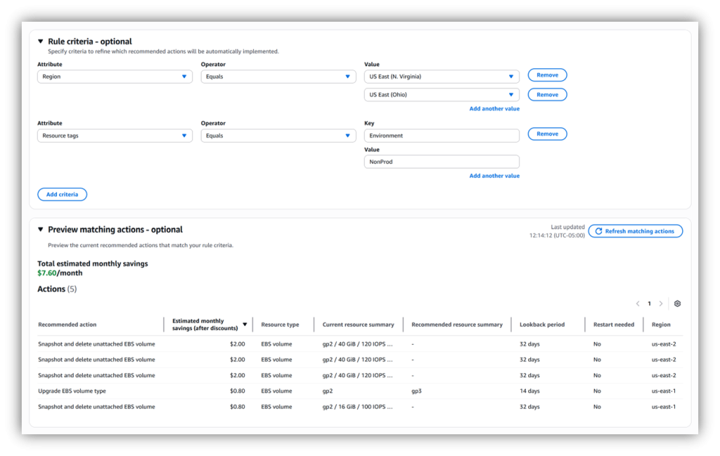 ルールを日次、週次、または月次で実行するように設定すると、Compute Optimizer はその条件に照らして新しいレコメンデーションを継続的に評価します。これにより、新たに特定された “アタッチされていないボリューム” は自動的にスナップショットが作成されて削除され、古い世代のボリュームタイプはルールに従って自動的にアップグレードされます。手動での介入は必要ありません。