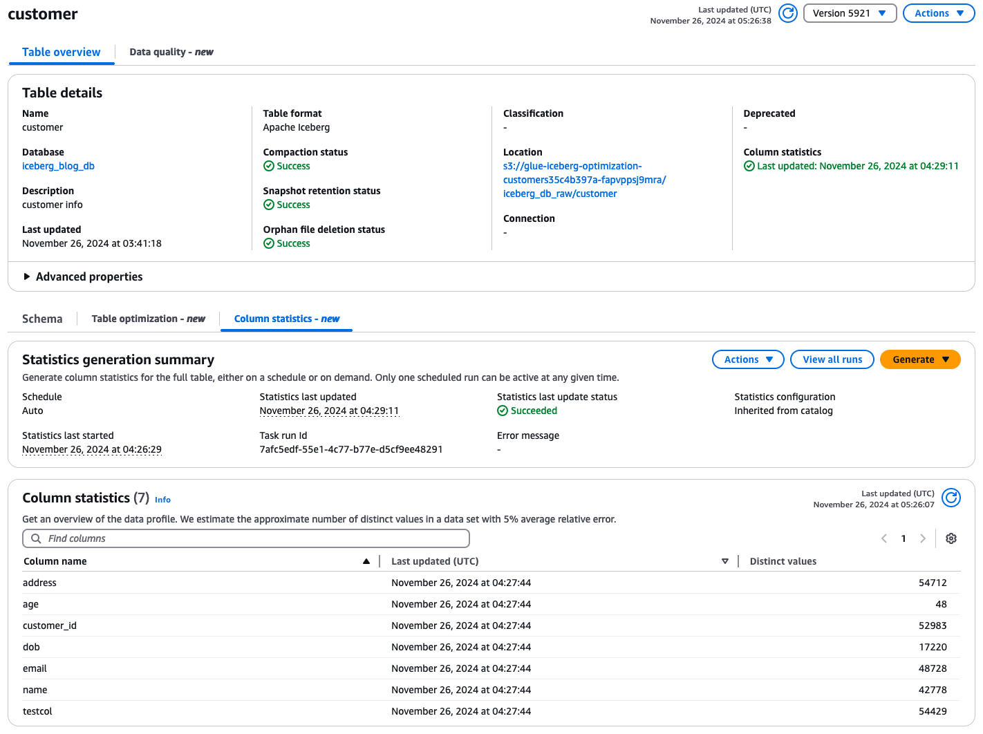 以下は、カタログレベルの統計収集が適用され、統計が収集された Iceberg テーブルの画像です:
