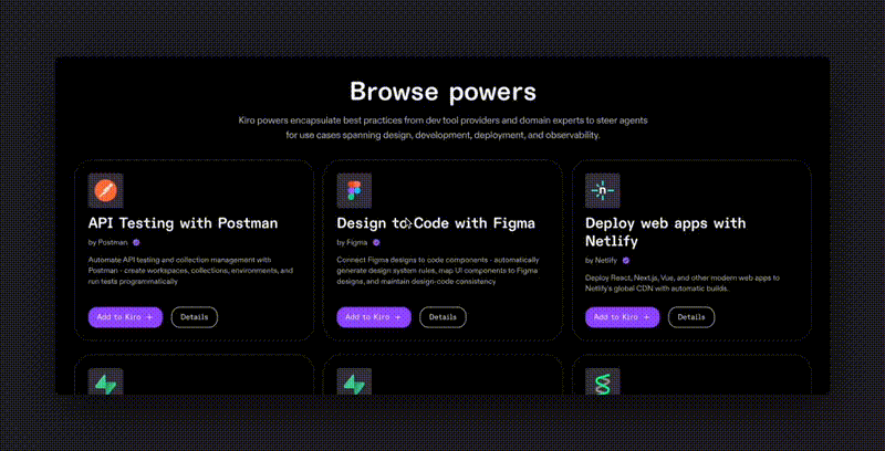 現在、powers は Kiro IDE で動作します。私たちは、powers があらゆる AI 開発ツール(Kiro CLI、Cline、Cursor、Claude Code など)で動作する未来に向けて構築しています。Model Context Protocol はツール通信の標準を提供します。Powers は、パッケージング、アクティベーション、知識転送の標準でこれを拡張します。power を一度構築すれば、どこでも使用できます。