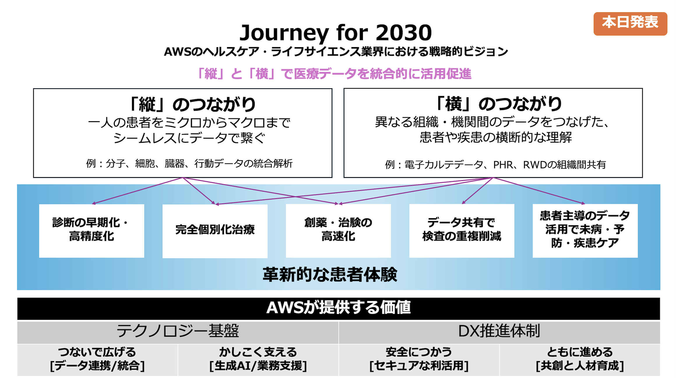 このたび AWS ジャパンは、日本のヘルスケア・ライフサイエンス業界に向けた戦略的ビジョン「Journey for 2030 データがつながる、価値を生む」を発表しました。このビジョンは、医療機関や製薬企業など患者を取り巻く多様なステークホルダーが、組織の壁を越えてデータを連携させ、革新的な患者体験を実現するうえでの AWS の貢献を示すものです。
