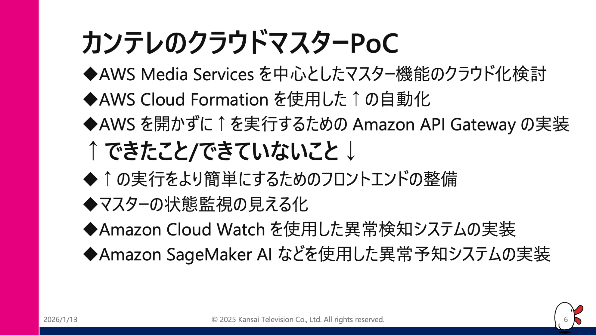 2025 年 7 月 4 日(金)および 2025 年 12 月 17 日(水)に、メディア業界のお客様向けに AWS 勉強会を開催いたしました。放送局のお客様にご登壇いただき、 AWS の活用事例についてご紹介いただきました。登壇者の所属部署および肩書きは登壇当時のものとなります。